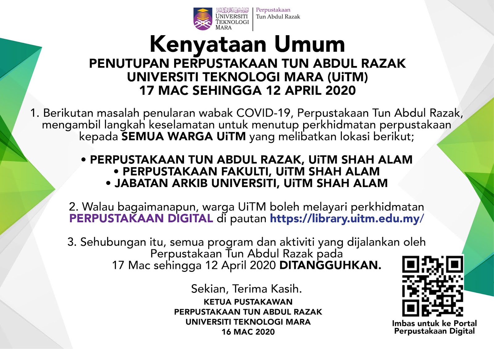 Notis Waktu Perkhidmatan Ptar Tutup 17 Mac 12 April 2020 Perpustakaan Uitm